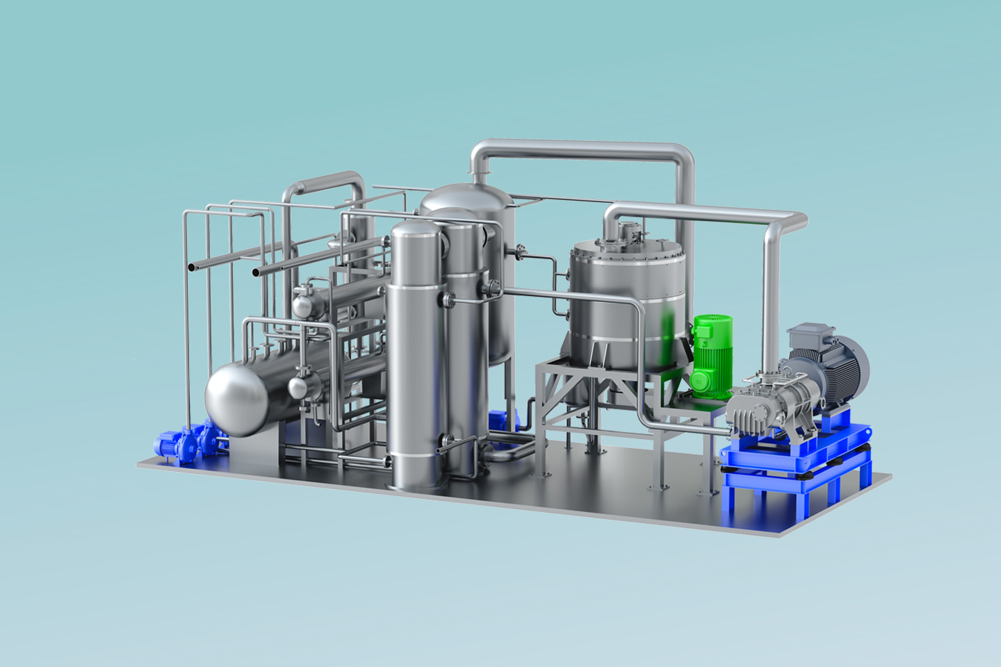 MVR熱泵精餾系統(tǒng)以高效旋轉精餾床為基礎,利用離心力場代替重力場,強化相與相之間的相對速度和相互接觸,通過強化傳質傳熱來提高分離效率縮小設備體積。 通過在系統(tǒng)中引入適用于小流量、大壓比的螺桿式蒸汽壓縮機,即可實現(xiàn)MVR循環(huán)熱泵精餾。